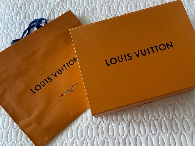 Detalles del productoElegante caja y bolsa de la marca Louis Vuitton. Son de color naranja y están en perfecto estado.