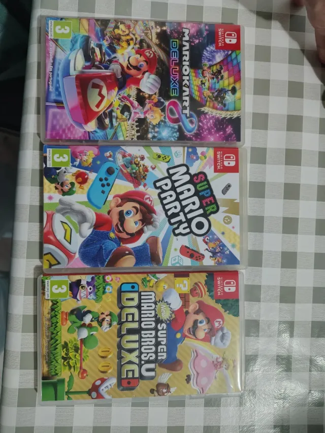 Lote de tres cajas de juegos para Nintendo Switch. - Mario Kart 8 Deluxe - Super Mario Party - New Super Mario Bros. U Deluxe