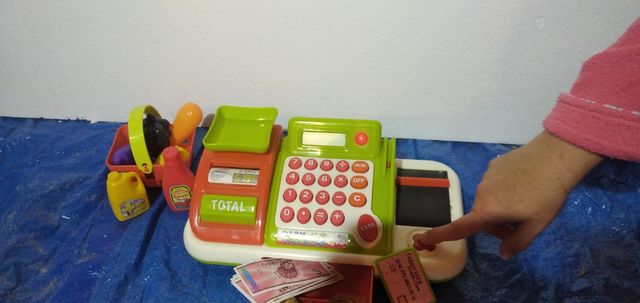 Cajero automatico, con dinero en monedas, billetes y tarjeta bancaria. Tiene calculadora, Peso con precios de productos, banda magnetica con sonidos