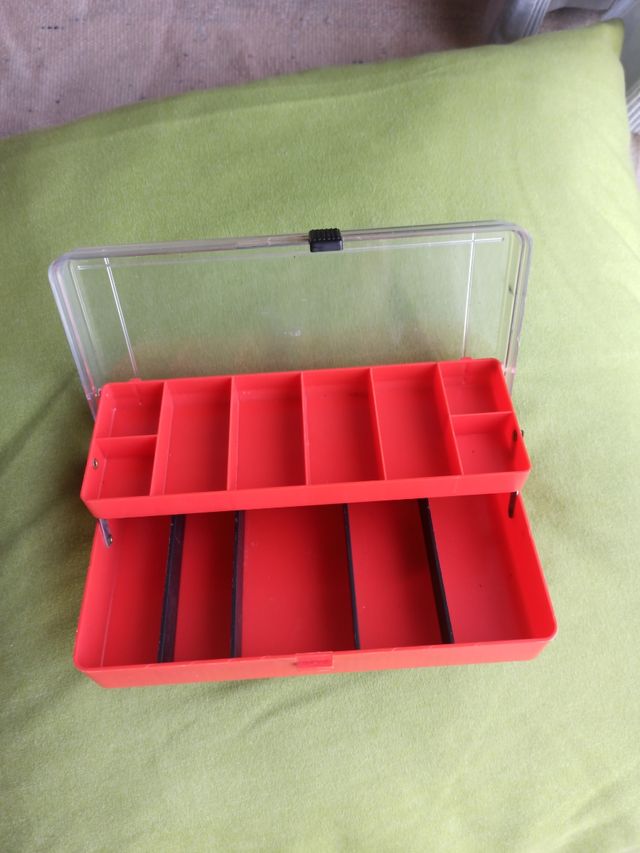 Detalles del productoCaja de plástico fuerte, con departamentos los de abajo regulables, para clasificar, joyas, gomas, clips, tornillos etc. cierre seguro. Medidas del producto