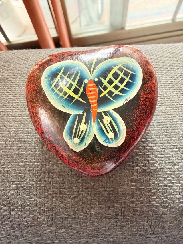 Bonita cajita con forma de corazón, decorada con una mariposa pintada a mano. - Diseño de mariposa colorida. - Base con acabado rústico en rojo y negro.