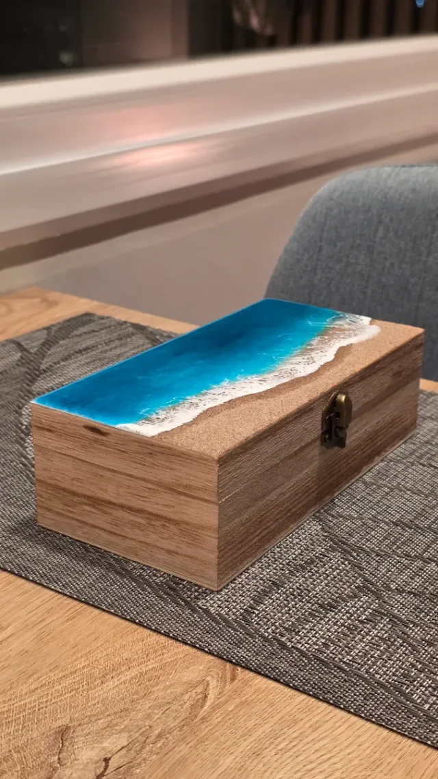 Detalles del productoPreciosa cajita decorada con un diseño de mar y playa hecho con resina epoxi. Al abrirla, verás el fondo del mar con un efecto de profundidad realista con detalles, estrellas y piedritas brillantes. Está hecho a mano artesanalmente por mí por lo que no existen 2 iguales. Mide 20x10cm y de fondo 6cm. Más cuadros y marinas en mi perfil 💙🌊🌊💙