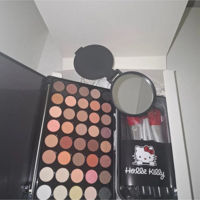 Contiene 3 productos. - Paleta con 35 sombras de ojos en tonos neutros y rosados. - Incluye un espejo. - Estuche con brochas con diseño de Hello Kitty.