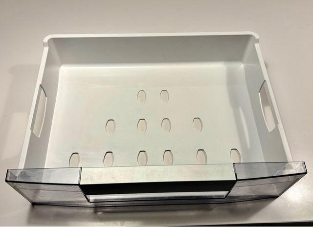 Detalles del producto3. Cajón de plástico para frigorífico De Dietrich. Tiene asas a los lados y un frontal transparente.