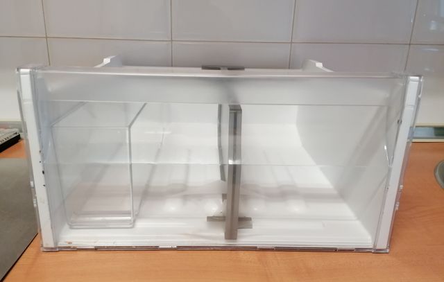 Detalles del productoCajón extraíble de congelador para frigorífico Whirlpool modelo BSNF 9152 OX. Fabricado en plástico transparente con divisor.