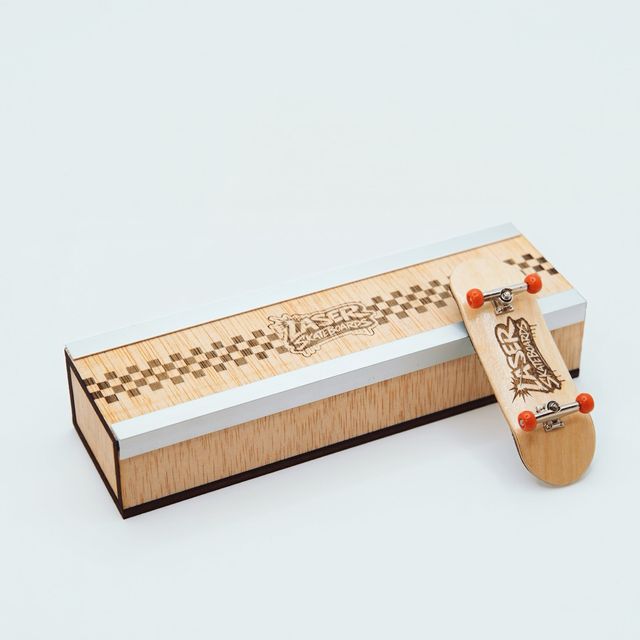 Cajón para finger skate con diseño de tablero de ajedrez y logo de LASER SKATEBOARDS. No incluye un finger skate. - Cajón de madera con detalles metálicos