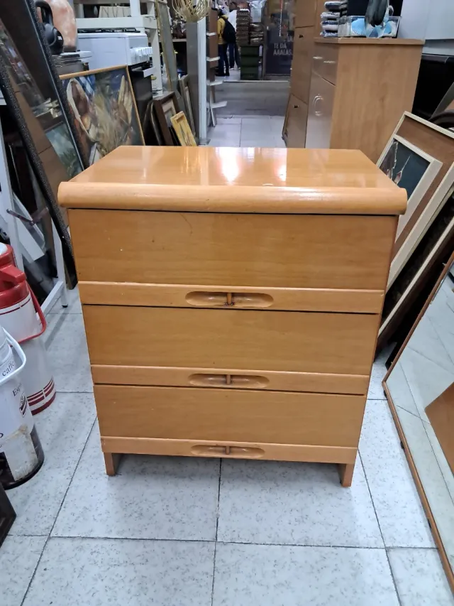 Mueble de madera clara con tres cajones. - Diseño sencillo y funcional. - Tiradores integrados en los cajones. - Acabado liso y brillante.
