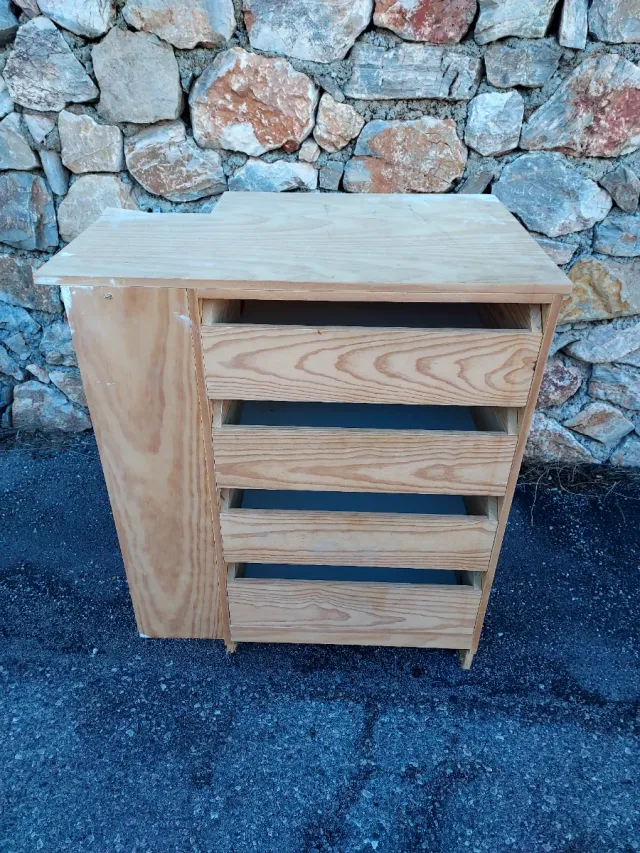 Cajonera de madera con 4 cajones, 64 x 59 d fondo x 99 d alta,SE LE PUEDE CORTAR LA ESCUADRA Q PEGABA AUN PILAR Y DEJARLA CUADRADA.