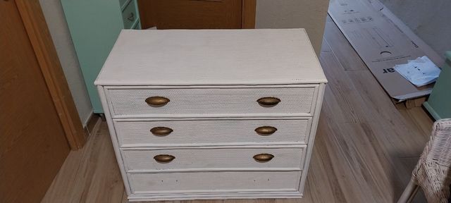 Cajonera en material mimbre pintado en blanco. Con tiradores dorados. Medidas 83 ancho × 70 alto y 41 fondo. Para seguir restaurando. RECOGIDA CERCA DE TOLEDO/MORA