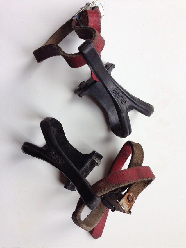 Calapies antiguos de carretera, completos y bien conservados, cintas de cuero rojo. Colección.