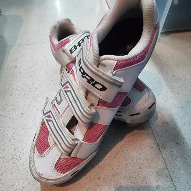 Calas de ciclismo para mujer de la marca B-PRO. - Color blanco y rosa. - Cierre de velcro. - Talla 38.