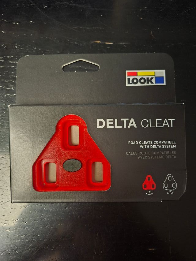 Calas Look Delta cleat de color rojo, nuevas a estrenar. - Compatibles con sistema Look Delta. - Incluye 2 calas y tornillos. - Se encuentran en su embalaje original.