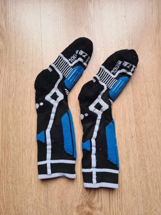 Calcetines de esquí para niño o niña, talla 27/30. - Marca Wed'ze - Ideales para la nieve - Diseño en negro con detalles blancos y azules. - Tejido con 100% lana.