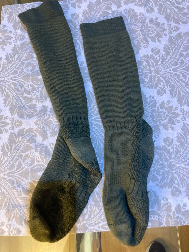 Detalles del productoPar de calcetines largos de color verde oscuro, diseñados para mantener los pies calientes en climas fríos.