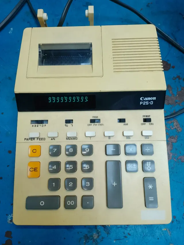 Calculadora Canon P25-D con función de impresión. Funcionando Va a 220 V. - Pantalla digital. - Teclado numérico completo. - Funciones de suma, resta, multiplicación y división.