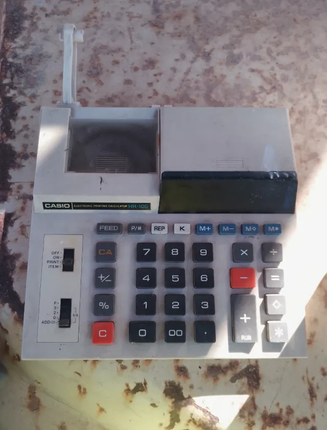 Calculadora con impresora Casio HR-100, fabricada en Japón. Artículo Vintage ideal para coleccionistas o decoración retro de oficina. Presenta signos de uso propios del tiempo. No dispongo de más información sobre su estado, por lo que se vende como objeto de colección o para restaurar. Se entrega tal cual se ve en las fotos. Buen diseño clásico y pieza interesante para amantes de la electrónica antigua.