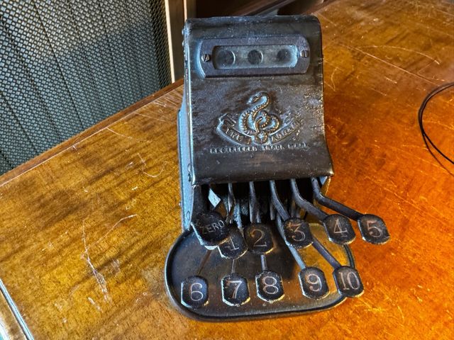 Calculadora manual antigua con teclas numeradas. - Diseño metálico. - Teclas con números del 0 al 10.