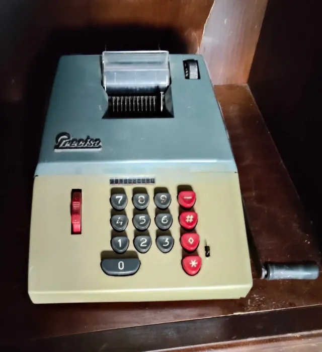 Calculadora mecánica antigua de la marca Precisa. Un objeto de colección con un diseño retro. - Teclado numérico. - Palanca lateral. - Manivela para operar.
