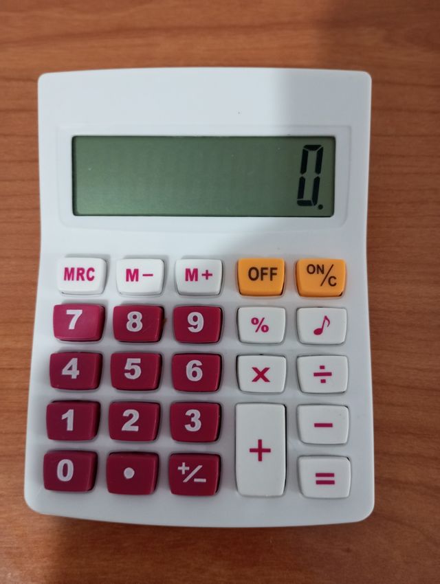 Calculadora de color rosa con pantalla digital. - Botones numéricos y de operación. - Funciones básicas de cálculo.