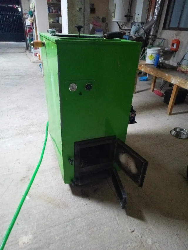 Detalles del productoCaldera de biomasa de color verde, con dos puertas frontales y dos manómetros.