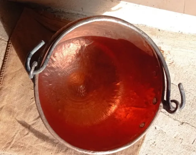 Detalles del productoCaldera antigua de cobre con dos asas de metal.