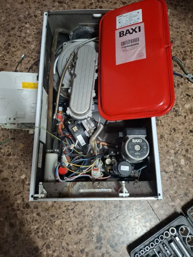 Caldera de gas marca Roca modelo Baxi neodens plus. PARA PIEZAS - Componentes internos visibles. - Depósito de expansión - Bomba de circulación