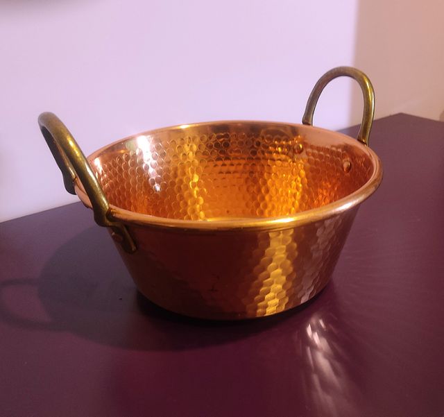 Detalles del productoPreciosa caldereta de cobre antigua con dos asas. Ideal para decoración o uso culinario. - Fabricada en cobre macizo.