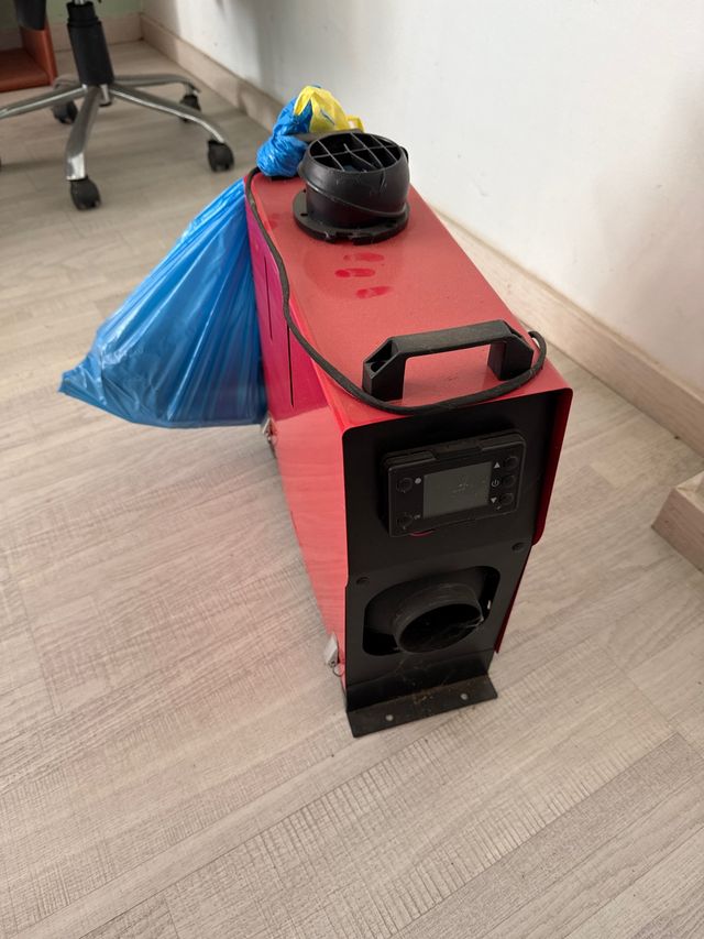 Viene con todas las piezas, la tuve montada en la furgo de manera de quita y pon. Puedo indicar como usarla. Sirve muy bien pra espacios pequeños calienta muy rapido. Funciona con 12-24v y diesel.