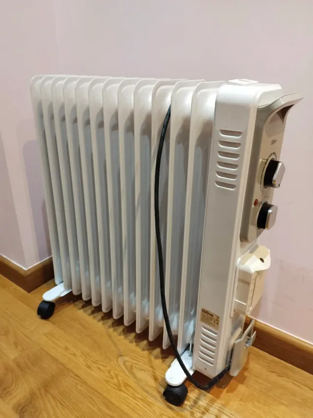 Detalles del productoRadiador eléctrico de aceite en color blanco. Cuenta con ruedas para facilitar su movilidad y un sistema de enrollado de cable.