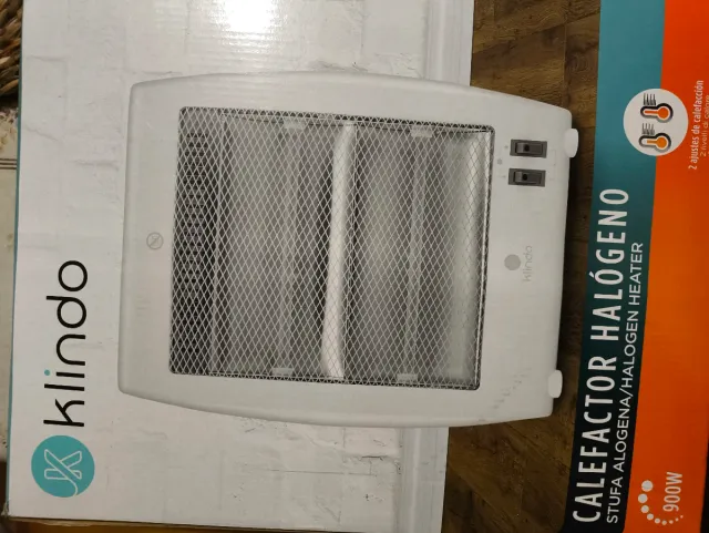 Calefactor halógeno de la marca Klindo con 900W de potencia. Cuenta con dos ajustes de calor para regular la temperatura. - Dos niveles de calor. - Diseño compacto.