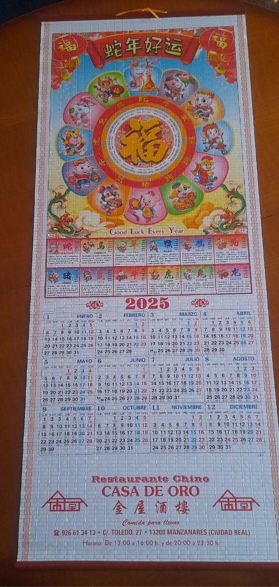 Calendario de pared de un restaurante chino. Con animales graciosetes. 1€.