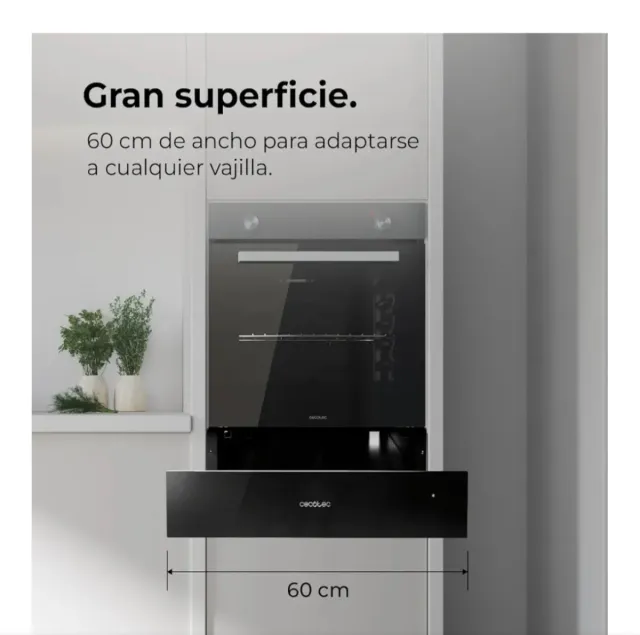 Detalles del productoCalentador de platos Cecotec con una gran superficie de 60 cm de ancho.