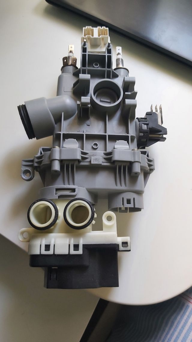 Detalles del productoComponente de calentador para lavavajillas Fagor. Pieza de plástico gris con conexiones eléctricas.