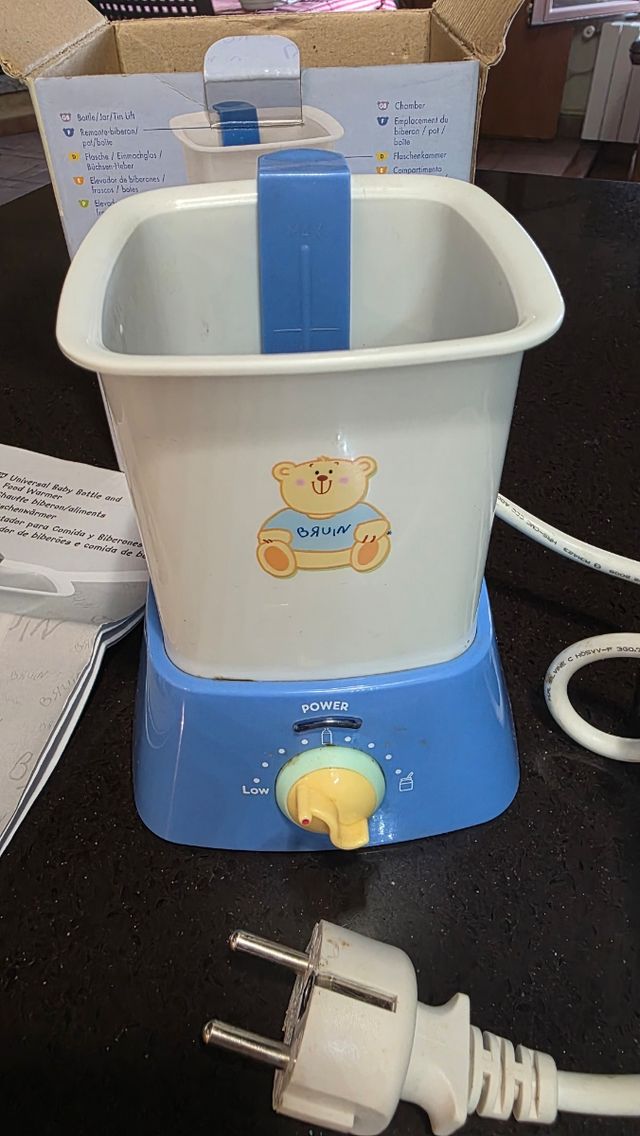 Calienta biberones y comida para bebé de la marca BRUIN. Incluye un práctico elevador. - Diseño con un tierno osito. - Dos niveles de temperatura: bajo y alto.