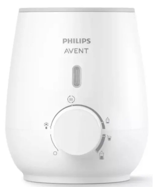 Calienta biberones de la marca Philips Avent. Su diseño es blanco y compacto. - Indicador luminoso. - Dial giratorio con diferentes ajustes.