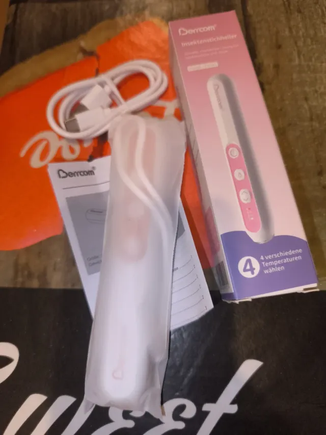 Dispositivo para aliviar picaduras de insectos. - Incluye cable de carga USB. - Diseño en color blanco y rosa. - Incluye manual de instrucciones.