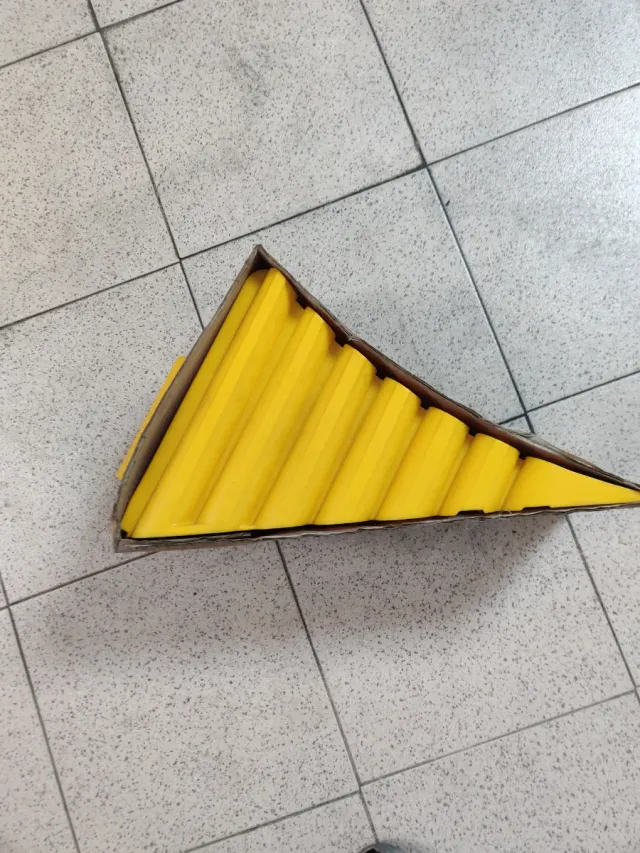 Calzo de rueda de gran tamaño, diseñado para asegurar vehículos. - Color amarillo. - Forma triangular.