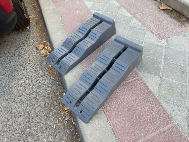 Detalles del productoSet de dos calzos niveladores de plástico resistente, ideales para estabilizar vehículos.