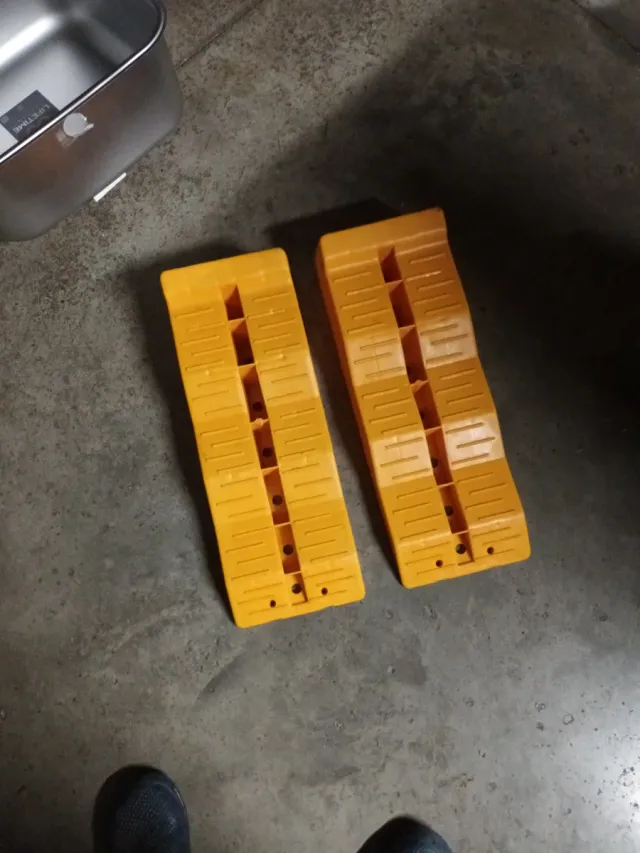 Juego de dos calzos de color amarillo, diseñados para nivelar autocaravanas. - Material: Plástico resistente. - Color: Amarillo. - Cantidad: 2 unidades.