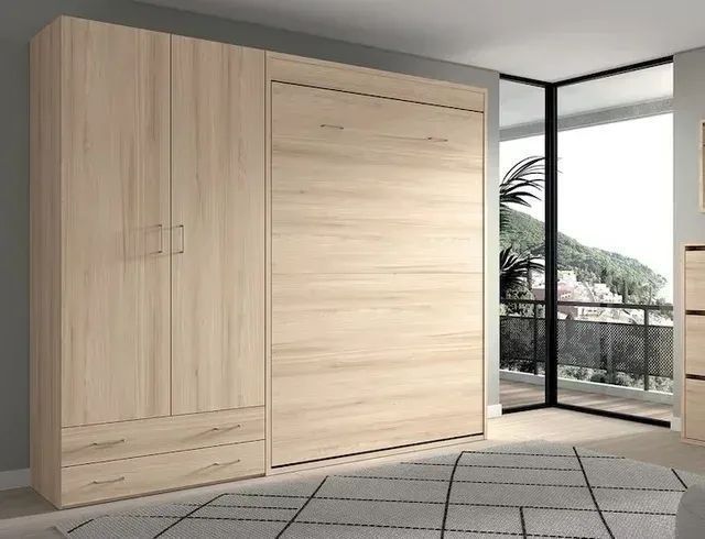 Detalles del productoCama abatible de matrimonio con sistema de apertura vertical, para colchón de 135×190, con somier de láminas interior, sistema seguro de apertura, cinchas sujetacolchón, excelente calidad y acabados y diferentes opciones de color a elegir. Armario de 2 puertas y 2 cajones de 80 de ancho.
