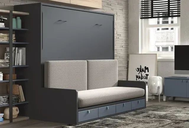 Detalles del productoCama abatible de matrimonio, fondo 42, con sofá incorporado y cajones inferiores con guías metálicas, para colchón de 135×190, con somier de láminas interior, pistones hidrahúlicos y diferentes opciones de color a elegir.