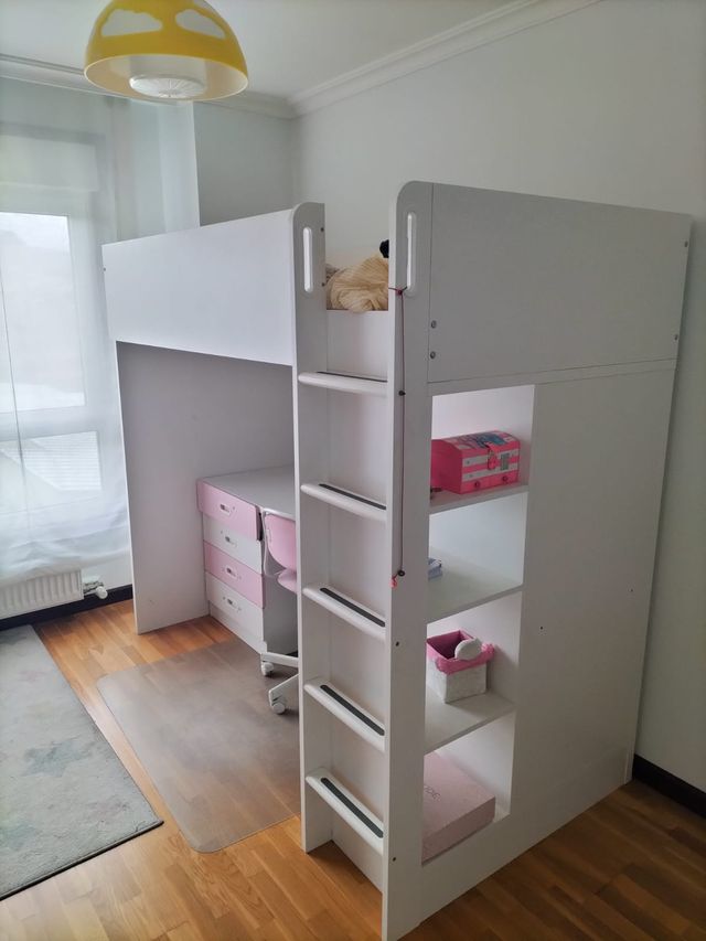Detalles del productoConjunto de cama alta con escritorio de la serie STUVA de IKEA. Ideal para optimizar el espacio en habitaciones.