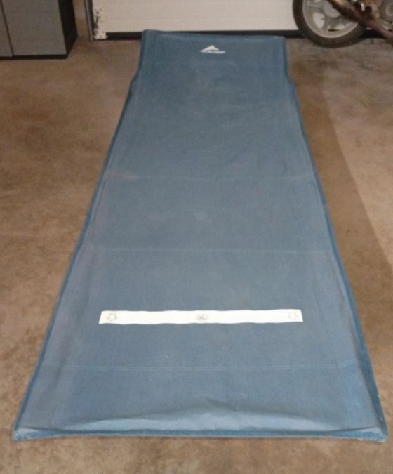 Cama de camping azul y blanca