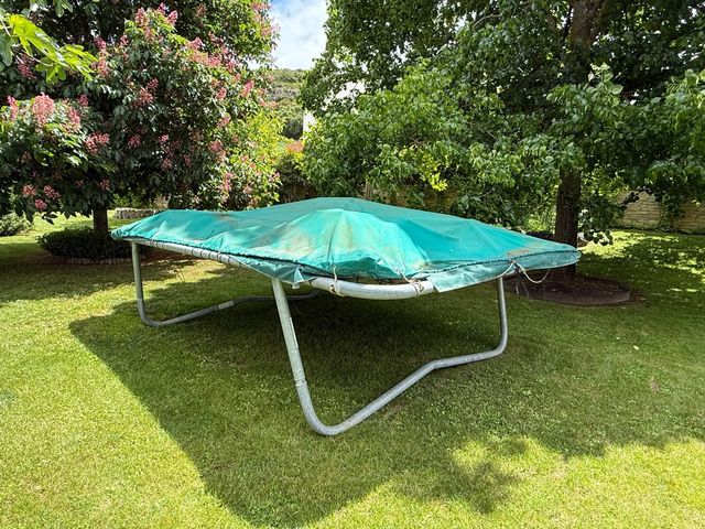 Detalles del productoCama elástica para exterior de 5x3 metros. Está en buen estado, aunque algo desgastada por el uso.