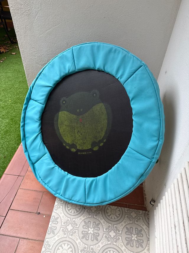 Detalles del productoCama elástica para niños con un divertido diseño de rana en la superficie de salto. El borde está acolchado en color azul.