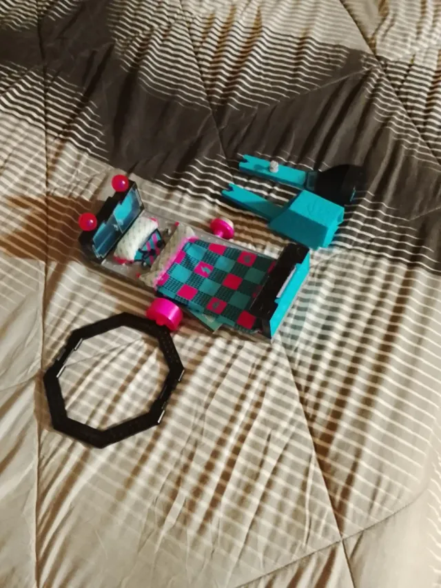 Set de cama y baño para muñeca Frankie y Drácula. - Cama con diseño a cuadros. - Accesorios de baño incluidos. - Colores vibrantes.