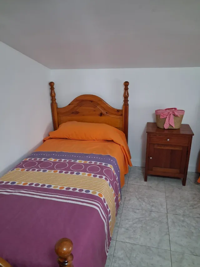 Cama individual y mesita de noche de madera.