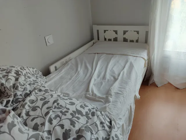 Cama infantil de IKEA modelo KRITTER. Ideal para habitaciones de niños. - Estructura de madera blanca. - Diseño con cabecero decorado. - Incluye colchon