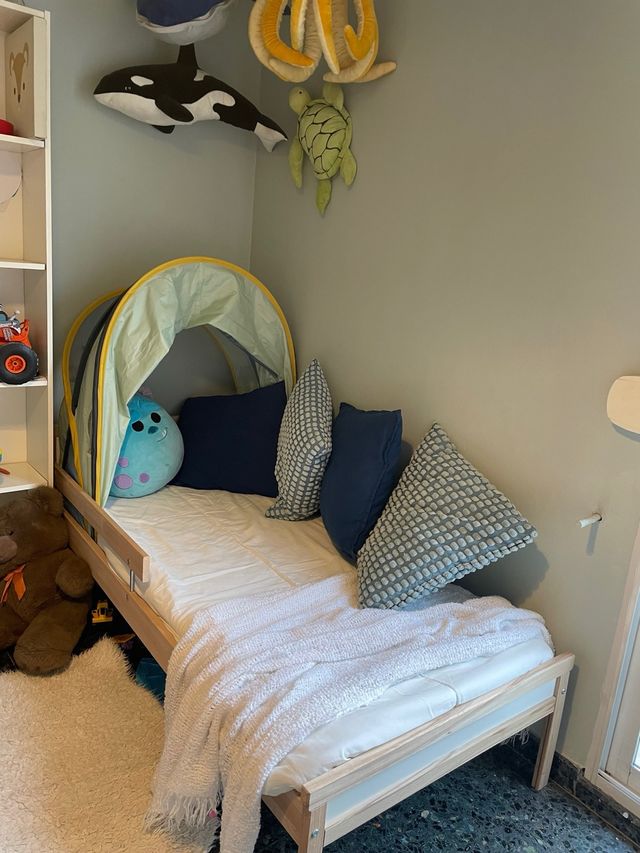 Estructura de cama de madera maciza con somier de láminas, cabecero, piecero y barrera de seguridad. Las medidas son 70x160cm.