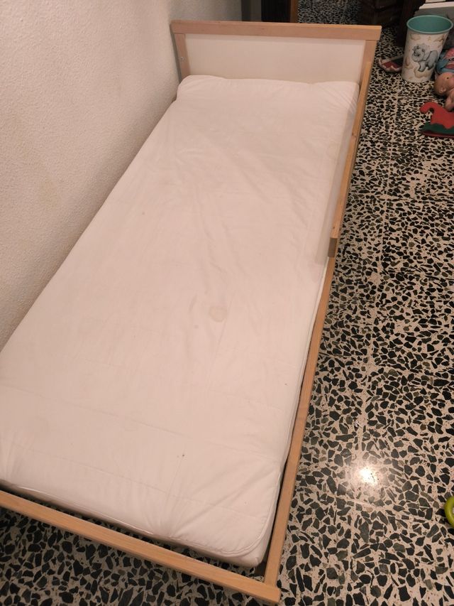 Cama para niños pequeños en buen estado, ideal para habitaciones infantiles. - Estructura de madera clara. - Cabecero blanco.